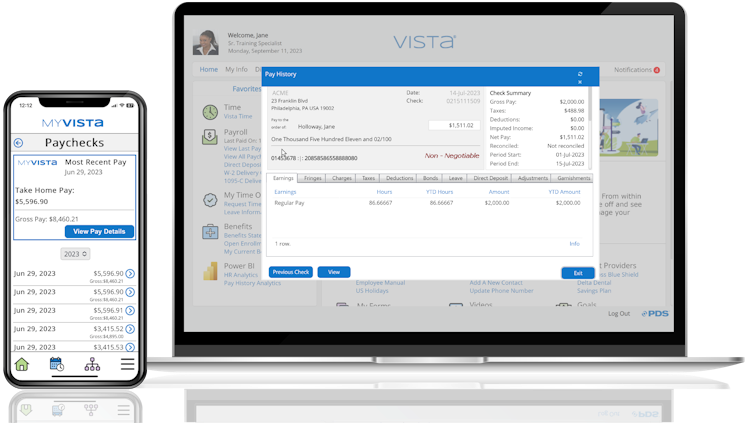 Vista Payroll includes a built-in check calculator, which allows enterprises to handle earnings, time entry, fringes, deductions, and other data via a unified portal. Employees can also check time entries and access paycheck history and W-2s and 1095-Cs tax forms using a self-service portal.
