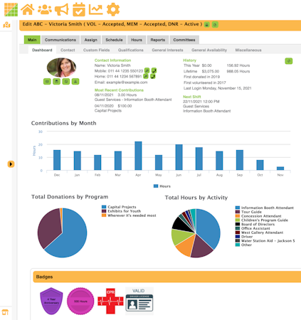 Volunteer profiles consolidate all personal information including responses to application questions, uploaded documents such as background check results and certificates, as well as qualifications. Users can communicate with volunteers via email directly from their profile or send an internal private message for them to see once they login. Users can easily assign volunteers to shifts and view their schedule in list and calendar format.