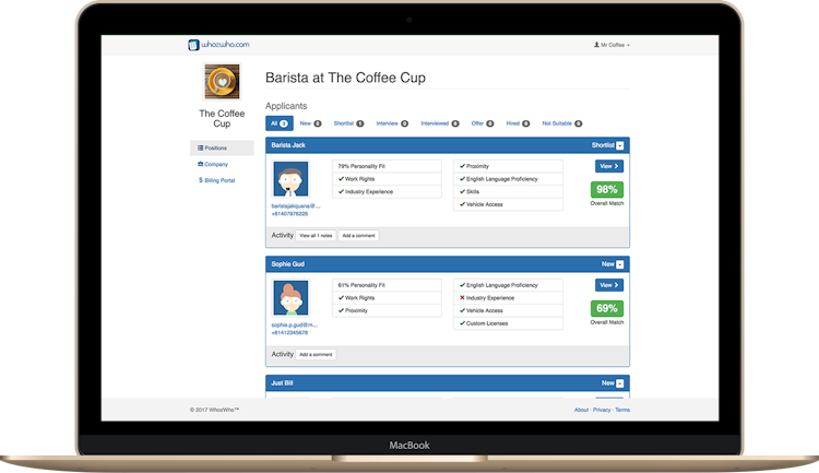 Whozwho is a cloud based smart applicant tracking and ranking (ATS) system designed for SMEs that combines behavioral science with a smart shortlisting tool to help match people to jobs, and jobs to people. The solution uniquely sorts, ranks and prioritizes candidates based on custom selection criteria, including personality and job fit. Companies can raise a job and post to top job boards such as Indeed in real time.