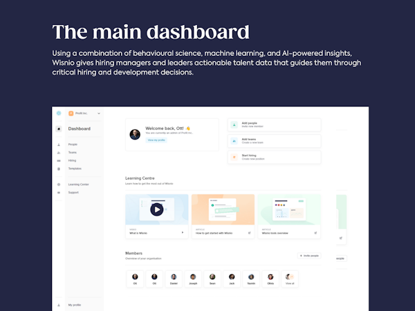 Wisnio brings clarity to the most complex hiring decisions with actionable talent data and AI-powered insights that guides users through critical hiring and (team) development decisions. People work in teams, and hiring and assessment usually focus on individuals. Wisnio combines data from individuals that form a team for a data-based approach to team development, hiring, onboarding, and succession planning.