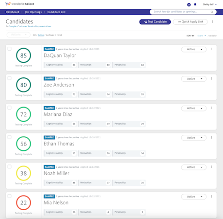 • Wonderlic Select combines candidates’ scores across all three assessments, allowing users to directly compare candidates.