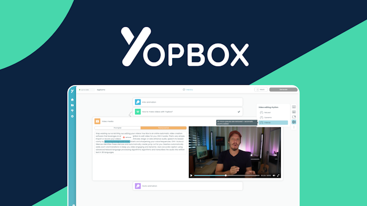 Yopbox is an online automatic video creation platform that utilizes AI and voice recognition technology to edit videos effortlessly. With Yopbox, users can create high-quality videos in minutes without the need for any training or technical skills. This innovative software offers a range of features that enhance the videos, including AI-enhanced audio, automatic zoom and transitions, accurate captions, smart background music, and custom branding options. Yopbox also simplifies the creative process by providing script templates, a built-in teleprompter, and the ability to edit videos by editing text.