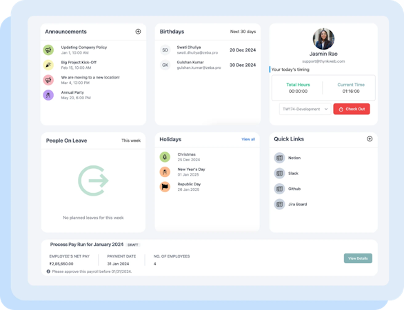 Zeba Pro is a comprehensive human resource management system designed specifically for Indian startups and small as well as medium enterprises. The platform integrates essential HR functions including payroll processing, attendance tracking, leave management, employee onboarding, and compliance automation into a single interface. The system maintains employee records, skills information, and associated documents in a centralized location. The platform features advanced attendance tracking capabilities that monitor employee work hours, absenteeism, and punctuality with precision.