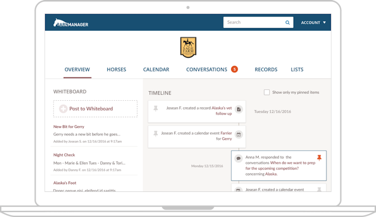 BarnManager is a cloud-based barn management software solution which helps managers of horse barns and stables streamline daily management responsibilities.BarnManager supports online record management as well as other simple business tools like scheduling and appointment management. Users can also create detailed horse profiles, track medical records and more from any desktop, smartphone or tablet device.