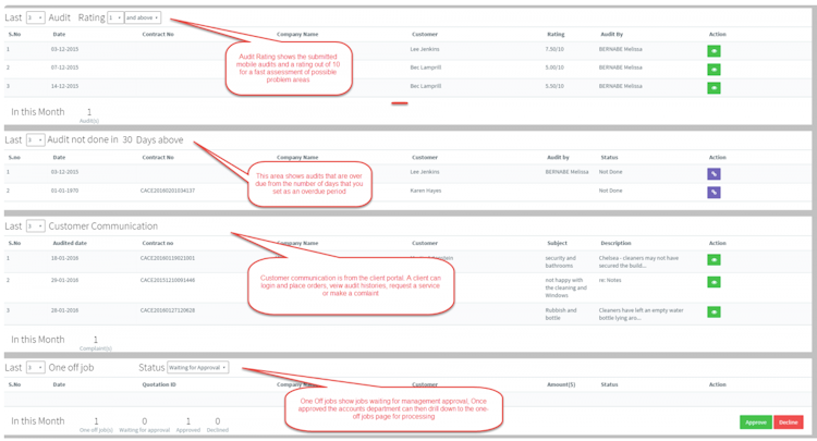 Central Information Management Dashboard: CBS allows users to view all critical business information at a glance, customer communications and complaints, follow-up issues, Mobile Audit reports, Overdue Mobile Audit Summary, Periodical Cleaning Status, Cleaner Site Login Details and more.