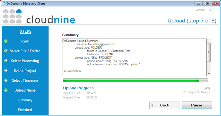 1. Upload - To get started, simply upload your data directly into our private and protected cloud environment and CloudNine’s automated processing will immediately begin to convert your documents into a searchable and reviewable format.
