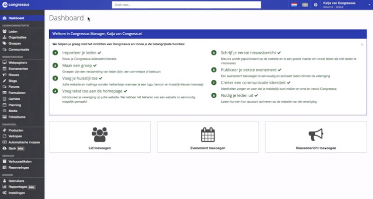 Congressus is a Dutch-language SaaS solution for the complete membership administration of small and large associations with support for financial management. Features include collections management, newsletter distribution, website management, statistics, forums, and email marketing. Association members have access to a self-service portal to view and modify their own data.