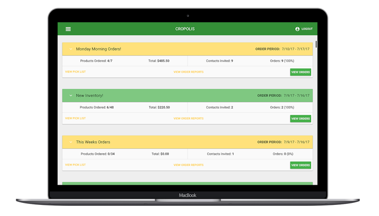 Cropolis is an online food sales management tool for small to medium sized local food-producing farms from all backgrounds by streamlining food marketing and sales. Farmers are able to send order forms and process incoming orders across multiple customer types such as grocery stores, restaurants, wholesalers, schools and farmer’s markets. The client portal allows customers to place direct orders from dynamic product lists, find new products and get seasonal updates, as well as track their orders and deliveries.