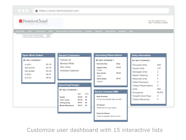 DomicoCloud is a business management solution designed to help self storage companies manage processes related to accounting, payments, sales, and more. It allows facility managers to communicate with tenants via email or text, and store all conversations in their accounts on a centralized platform. Managers can create, assign, and track maintenance, security, or other tasks across contractors or employees, to help increase operational efficiency.
