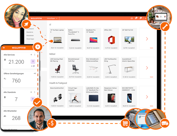Companies use equipme to digitalize and streamline the entire employee equipment process, from user demand over approval to vendor management and the subsequent spend and asset management process.