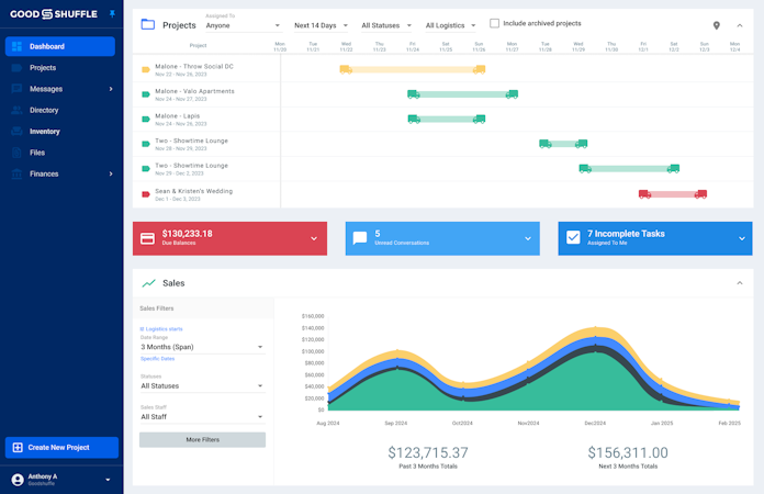 Transform your event rental business with Goodshuffle Pro, the all-in-one software solution designed for event professionals. From A/V and tenting to party rentals and production services, our platform streamlines your entire operation. Manage inventory with lightning-fast mobile barcoding and real-time conflict detection, create photo-rich proposals, accept digital signatures and payments, manage deliveries, and track your business performance through intuitive dashboards. Whether you're a boutique rental company or a large-scale production firm, our user-friendly platform adapts to your needs — and is backed by unlimited training and support.
