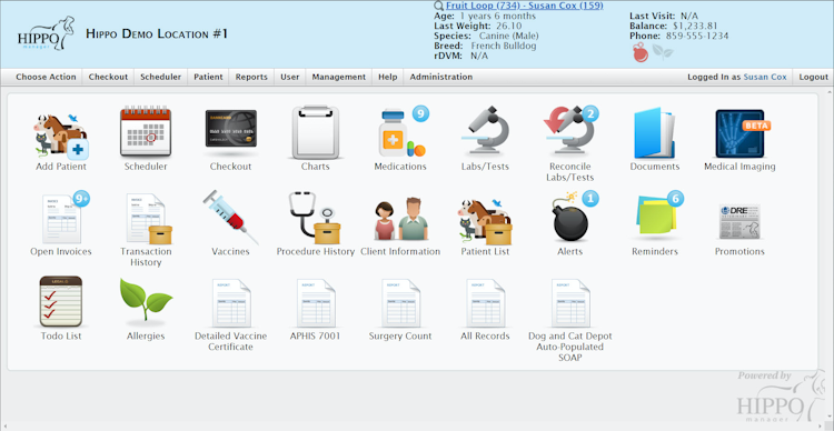 Hippo Manager is cloud-based, full featured veterinary software that serves as the central nervous system for your practice, integrating your patient data with labs, pharmacy, client communication and more. Its easy to use, patient-centric and improves profitability by saving time and capturing charges. Our pricing is simple: $119 per month, per full time veterinarian. Training and support are always free and unlimited.