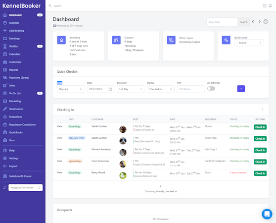 Kennel Booker is a mobile-friendly, cloud-based kennel management and reservations software designed for kennels, catteries, pet daycare, grooming and pet-sitting businesses which offers online payments, one click check-ins, email and SMS reminders, centralized customer and pet records, reporting tools, and more. As a cloud-based solution, Kennel Booker gives users the flexibility to manage their kennels anytime, anywhere, via any internet-enabled device, including smartphones and tablets. Kennel Booker allows users to manage their kennel’s services and bookings all from one system. The central dashboard provides users with a 360º overview of any bookings or booking requests, as well as their current occupancy. Online requests and automated email and SMS messages help to streamline kennel management, allowing customers to request appointments online at any time, and receive booking confirmations and reminders automatically. Kennel Booker integrates with Stripe so that businesses can accept secure online payments from customers. Kennel Booker securely stores all customer and pet records, giving users centralized access to all the information they need about customers and their pets. Users can also record vaccination, dietary, and medical information, which helps kennel staff manage pet dietary requirements and stay up-to-date with pet vaccinations with automated expired vaccination alerts. Kennel Booker enables users to create and send quick email postcards, with pictures, to show customers how their pet is getting on while they are away. Reporting tools help give users actionable insight into key metrics to understand kennel performance.