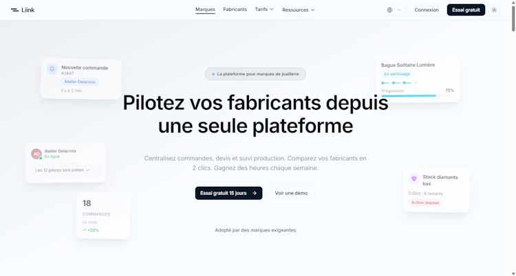Liink is a cloud hosted jewelry management platform that centralizes order administration, production oversight, and materials inventory for brands that outsource manufacturing to external workshops. The solution unifies communication and operational workflows between creative design teams and external production partners. The software addresses coordination complexity encountered by brands managing multiple production locations and more than ten orders each month. Manufacturers invited by partner brands are granted access without subscription fees. The platform is optimized for scenarios where in house production facilities are complemented by external workshops.
