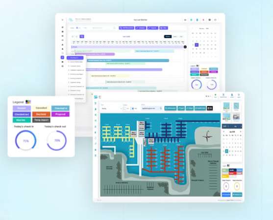 The system features an interactive marina map with real-time slip availability and visual dock management that enables assignment of slips via click-to-book tools based on view, slip number, or vessel dimensions. The reservation component supports daily, weekly, monthly, and seasonal rate models and includes a temporary departure function that permits leasing of unoccupied slips during vessel absences. Launch and return scheduling tracks vessel movements in real time and allocates staff tasks for incoming or outgoing boats. The billing engine automates core financial tasks through single charges, recurring invoices, split billing, custom discounts, and utility usage tracking.