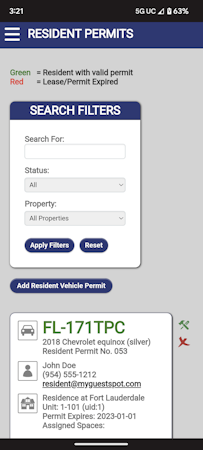 My Guest Spot's main interface includes various data to help identify unauthorized vehicles. Property managers can search and sort through resident and guest parking permits using license plate number, status, timeframe, and property name. Other accessible data includes date of permit issuance, visitor name, arrival/departure times, unit details, plus more. Other features include unique guest parking PIN codes, customizable unit descriptions, detailed activity logs, and a color coded mobile lot monitoring tool.