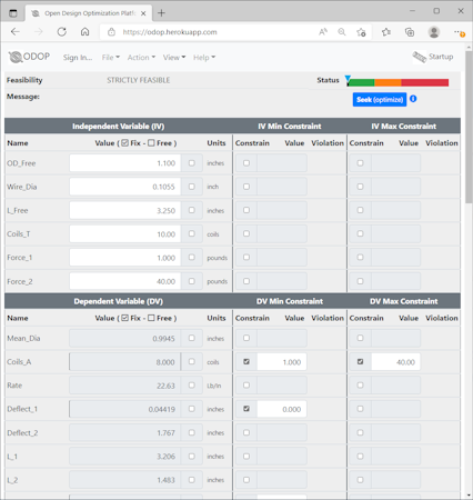 The Open Design Optimization Platform (ODOP) software is a web software application (web app) that provides features and capabilities to facilitate the design analysis and optimization of a broad range of problems that have a mathematical model available. ODOP:Spring is a spring design application of the ODOP software. It finds solutions for custom spring application requirements in mechanical engineering and machine design.