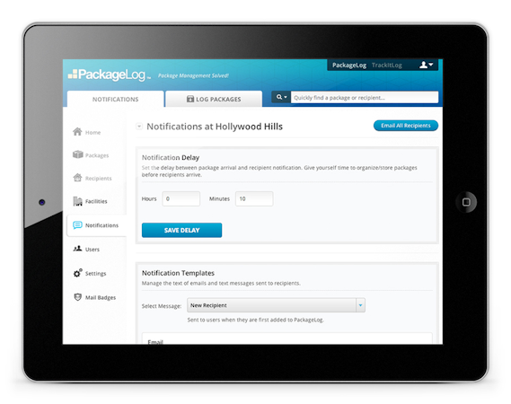 With PackageLog, users can manage contact details and locations for all package recipients to enable the automatic delivery of notifications. Recipients can control their personal preferences, and determine whether they want to receive notification and reminders by SMS or email. Users can also create notification templates, and add in delays to provide time for organization in between packages arriving and recipients being notified.
