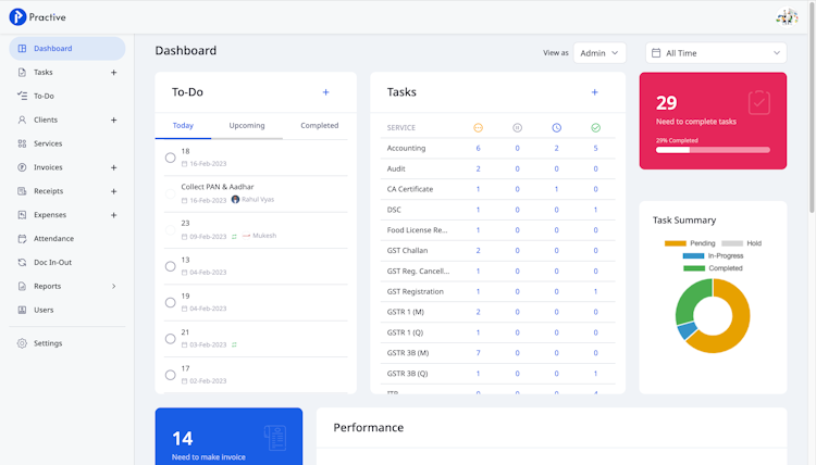 Practive is Office and Practice management software for Chartered Accountants and Tax Practitioners. It provides value-driven solutions to your CA firm, empowering you to accomplish more work in less time while drastically reducing bad debts. Get Payment Faster with Practive. Experience of the power of Practive.