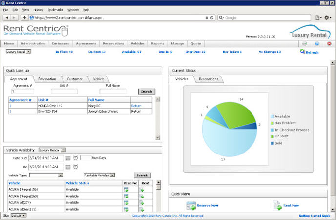 Rent Centric provides vehicle rental software which helps vehicle rental companies to manage their operations, customers, employees, and revenue. The software runs online via web and mobile applications. Features include a vehicle tracking system, maintenance record system, financial management, and fleet reporting. Rent Centric provides an internet reservation service via which customers can make vehicle reservations online. The software keeps a record of client profiles and their rental preferences for subsequent visits. It also enables operators to link or add this service to their website.