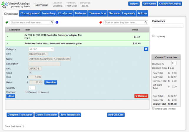 The point of sale allows users to buy, sell, and consign items in a single transaction, with options for split payments, voids, returns, and single item or whole transaction discounts.