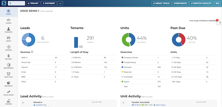 Storable Edge A 100% cloud-based, industry-leading solution designed to unify your self-storage operations. Manage your business seamlessly from anywhere, anytime, enhancing communication with renters, boosting efficiency, and driving revenue growth.<br/><br/><br/>Scalable automation for growth-focused operators. Save time and centralize control with Storable Edge. This comprehensive platform manages all aspects of your operations, from automated collections and robust reporting to integrated access control and professional facility websites, ensuring a streamlined and profitable business.<br/><br/>Access: Ensure easy access for operators and tenants with built-in debt collection—no effort required. Storable Access Control combines powerful automation with seamless integration to help you save time, enhance security, and simplify operations.<br/><br/><br/>Collections: Late and missed payments cut into your business growth. Storable has designed a solution that gets you paid faster, so you can spend less time chasing payments, and more time driving your self-storage operation forward..<br/><br/>CRM: Improve lead management. Grow and better serve your tenant base with experiences tailored to the unique needs of your business.<br/><br/>Insurance: Protect investments and boost revenue. Capture additional revenue with Insured-to-Value and Auto-Protect. <br/><br/>Facility Websites: Attract more customers and simplify the rental journey with professionally designed, SEO-optimized websites. Enable online rentals, digital contracts, and payments, creating a powerful online presence that converts leads into loyal tenants.