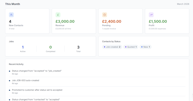 The platform includes a voice agent that enables hands-free administration through a predefined wake word. Users can generate quotes, invoices, job records, expense entries, and calendar events without manual data entry. The website builder produces multi-page, mobile-responsive sites within ninety seconds and incorporates lead capture forms that integrate directly with the CRM, photo galleries sourced from project documentation, search engine optimization configurations, and support for custom domains with SSL certificates. The job management module maintains detailed project histories with timestamped notes and before and after photo galleries. The quoting and invoicing tools produce branded PDF documents and enable single-click conversion of quotes into invoices. The expense tracking component automates receipt scanning, extracts transaction details, and supports calculations across multiple VAT rates.