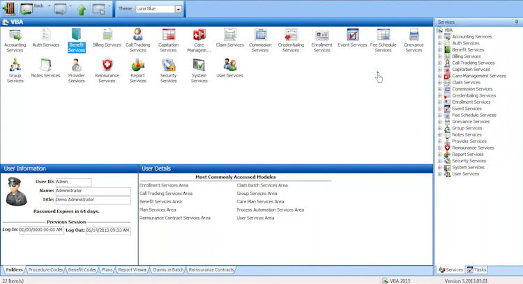 VBA also includes modules for authorizations, capitation, commission management, enrollment, notes, care management, reinsurance, events, call tracking, grievances, reporting, fee scheduling, provider management, premium billing, and more.
