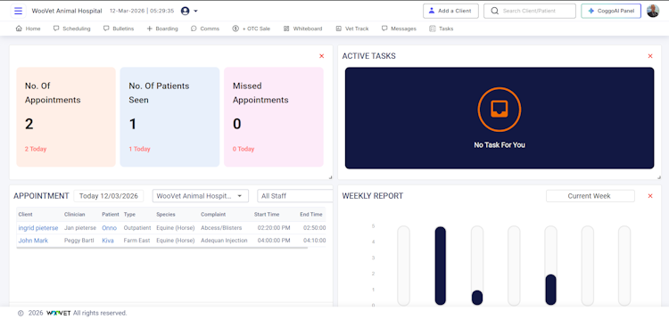 Key features include AI-driven CoggoVoice (converting conversations into SOAP notes), Coggo Assess (symptom & image analysis), and Coggo Summarise (complete case history summaries in seconds), along with customizable languages, EMR, smart inventory, online booking, and a CEO dashboard with insights. Integrated with labs, payment gateways, and the Woomypet app, Woovet empowers solo clinics, hospitals, universities, and multi-location enterprises to deliver better patient care and scale with ease.