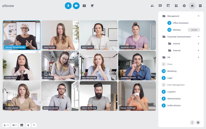 In the virtual alfaview rooms, several hundred people or more can be connected in real-time with video and audio. Companies, universities, training institutes and public institutions can network and collaborate with clients, partners and other companies worldwide. The clear design and user-friendly range of features make the software self-explanatory and intuitive for users.