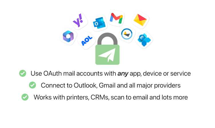 Auth-Email is an OAuth relay service that enables legacy applications, hardware devices, and scripts to connect to modern email providers through standard IMAP, POP, and SMTP protocols without native OAuth support. It addresses authentication challenges that occur when providers require OAuth for enhanced security and legacy systems rely on traditional username and password methods. The platform operates as a transparent proxy that handles OAuth authentication on behalf of connected systems while preserving interoperability with existing infrastructure. Full protocol compatibility extends support to all authorization methods and legacy connection protocols for older mail systems.