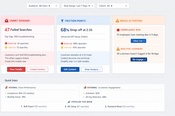 Identify exactly what your customers want to learn but haven't found yet, allowing you to close content gaps in real-time.