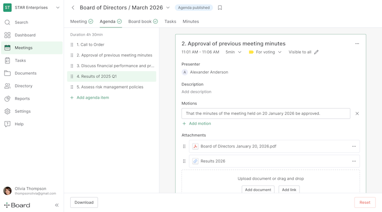 • Centralizes board meetings, documents, and decisions in a secure online workspace, supporting efficient governance for nonprofits and businesses