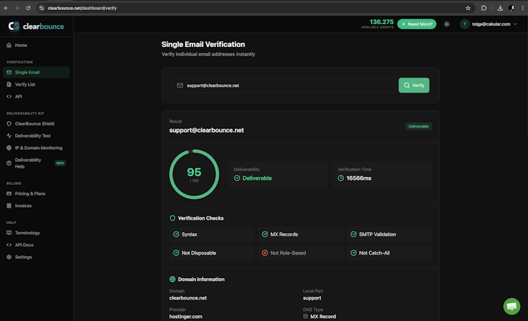The verification engine processes each address through multiple validation layers that include syntax validation for proper formatting, mail exchange record lookup to confirm domain mail server configuration, simple mail transfer protocol verification to establish mailbox existence, detection of temporary addresses, flagging of generic role-based accounts, catch-all domain identification, spam trap analysis to avoid honeypot addresses, and typo detection for common misspellings. Each address receives a comprehensive score and is categorized as deliverable, risky, invalid, or unknown, with high accuracy and a low unknown rate. Bulk list verification accommodates CSV, XLSX, and plain text formats or copy-paste input for large-scale processing, and detailed reports deliver breakdowns of deliverability and risk. The real-time verification application programming interface responds in under fifty milliseconds for single-address checks and supports both single and batch endpoints with webhook functionality. ClearBounce Shield provides a real-time form protection widget that integrates via a single line of JavaScript to block invalid, temporary, and risky addresses at the point of entry.