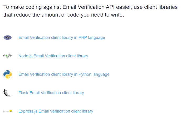 Since the email verification service comes in the form of an API, users can integrate it into their web applications, marketing platforms, and other existing systems. Email Verification API is available in several programming languages with different client libraries, making coding easier.