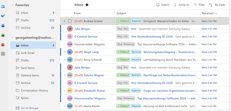 EmailManager is an email automation solution integrated into Microsoft Outlook. The software generates draft responses for routine inquiries directly within the Outlook environment. Response drafts are created and presented for review and manual approval to maintain professional oversight and ensure compliance. The add-in targets service oriented and regulated sectors in German speaking markets including property management, accounting, legal, real estate, recruitment and insurance mediation.
