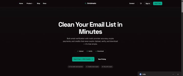 Enrichmatic is a bulk email verification platform designed to support email marketing professionals, agencies, and businesses in validating mailing lists and preserving sender reputation through multi-provider verification technology. The platform operates on a pay-as-you-go credit system with credits that never expire and accommodates both traditional payment methods and cryptocurrency transactions. It accepts CSV, TXT, and XLSX file uploads and employs a streamlined three-step workflow that auto-detects email columns and removes duplicate entries at no additional cost.