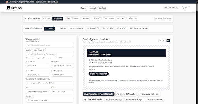 The generator outputs HTML table based code formatted for compatibility with major email clients including Gmail, Outlook desktop and web, Apple Mail and Thunderbird. All changes are preserved automatically in browser based local storage without manual save actions. A live preview panel updates with every modification and can display results on three background modes for readability verification. Configuration export and import functions use a JSON format to capture and restore the complete editor state across devices or team members. Multiple output options enable copying formatted signature for direct integration, copying raw source code, downloading as an HTML file and viewing the full code in a popup. The application operates as a standalone client side solution without reliance on external services or server side processing.