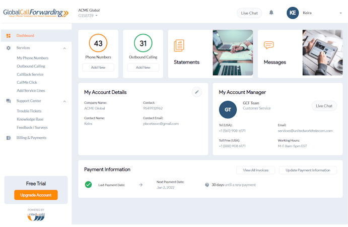 Global Call Forwarding is a virtual phone service provider, owned and operated by United World Telecom (founded in 1996).