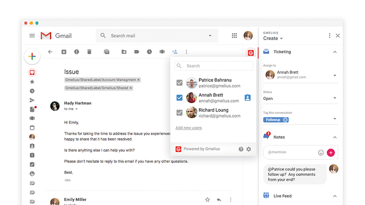 With Gmelius, users can create shared inboxes to manage group emails or shared Gmail labels to organize and share specific conversations. Teams can exchange internal notes, delegate emails to specific team members in one click, and turn emails into task cards. Emails can be transformed into task cards and added to shared Trello-like boards for action. All actions are synced in real-time to the whole team, across all their devices.