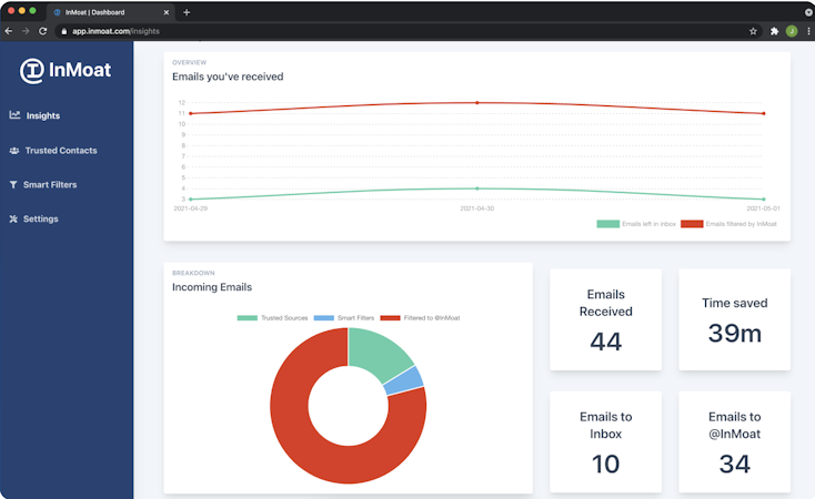 InMoat is an email productivity extension designed to help employees sort and manage business emails within the inbox and move unwanted emails into a custom folder. It allows professionals to prioritize emails from team members, clients, vendors, associates, and other known contacts and analyze inboxes to identify trusted contacts.