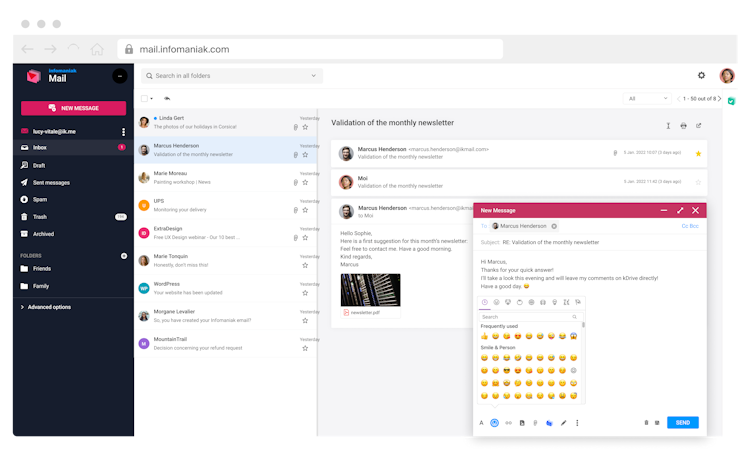 Infomaniak's Mail Service is a comprehensive and secure suite of online productivity tools, developed and hosted in Switzerland. It is a privacy-conscious email service, available for free with 20 GB storage and an @ik.me, @ikmail.com, @etik.com address or with a custom domain name and unlimited storage. The solution enables users to synchronize their contacts and appointments on all their devices.