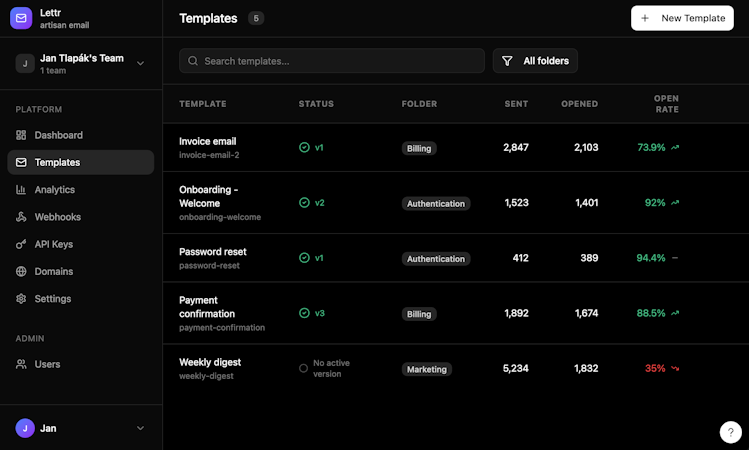 Templates are managed in a visual editor designed for collaboration. Developers set up the integration once, then product, design, and marketing teams can update transactional templates with version history and a draft/publish workflow—reducing dev tickets and avoiding redeploys for routine content changes. Lettr supports dynamic placeholders, multi-language templates, and HTML import for migrations.