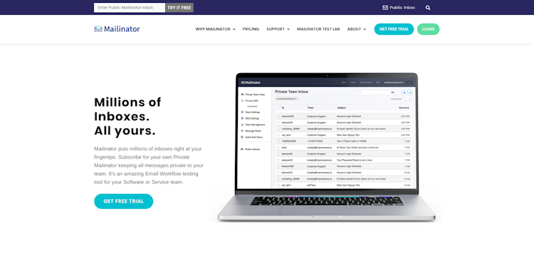 Mailinator is an email management software that helps businesses of all sizes receive marketing emails and text messages from various inboxes in a private domain. The platform enables administrators to manage message routing rules and secure logins via single sign-on. Managers can access attachments and click on links received via emails to automate message workflows. Mailinator allows teams to store old messages in private domains and automatically delete emails in public systems. Operators can also verify email receipts, facilitating load testing on a unified interface. Mailinator lets businesses retrieve emails in JSON format using programmatic access to poll inboxes. Operators can also receive messages via Twilio and Zapier, share accounts with colleagues, and view message summaries based on inboxes and domains.