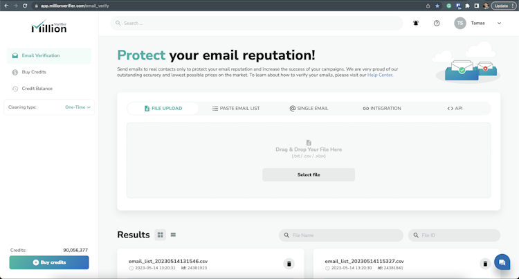MillionVerifier is a cloud-based email verification solution, which helps businesses authenticate email lists through syntax and domain existence checking. Key features include spam protection, secure data storage, SMTP verification, temporary/disposable email detection, and reporting. The application lets administrators remove duplicate email addresses from files, monitor email server DNS, and check email syntaxes. MillionVerifier allows users to perform bulk verification by uploading email lists in various file formats, as well as tracking and visualizing the progress of ongoing processes through graphs. Marketers can use the solution to generate SMTP connections with recipient servers and detect the existence of accounts and mailboxes, eliminating hard bounce rates for campaigns and ensuring accurate delivery. MillionVerifier offers API-based integration, which lets team members remove unauthorized email addresses from the database and notify users about misspells in real time. It also helps users conduct checks for blacklisted domains and perform re-verification of greylisted addresses. It also lets employees identify role-based email accounts associated with sales, support, or admin teams and create a targeted list of audiences for campaigns.