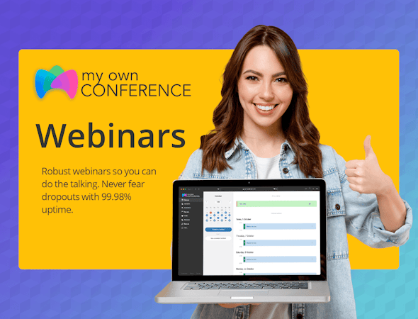A robust in-browser solution for your next webinar, meeting, or video conference. Host up to 10,000 attendees in confidence with a market-leading uptime of 99.98%.