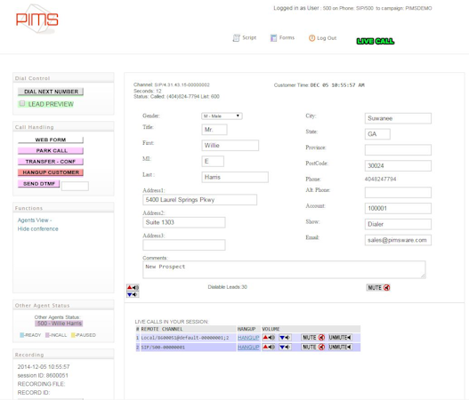 The Pims Auto Dialer is a full service call center suite with inbound, outbound and broadcast dialing functions. The system can also send custom text and emails based on call dispositions made by your agents.The application is web based and hosted from the Pims Auto Dialer data center in Atlanta Georgia. You can use Windows, Mac or Linux. Pims Auto Dialer provide a soft phone; all you need is a USB headset.