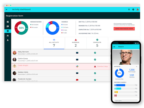 Reach enables organizations to communicate with targeted groups of employees via the individuals preferred platform, removing the need for employees to all use the same messaging platform. With activity dashboards, managers can see a list view of the channels each employee is opted into, as well as communications sent, scheduled, and in draft mode.