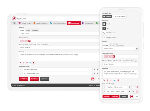 To create a notification, users are able to customize a pre-built RedFlag message template, or create their alert from scratch in a range of formats including email, SMS, and voice messages. With the click of a button, a message can be sent to multiple channels and all recipients are notified in real time when a message is received. Employees or members of groups are able to sign up to receive notifications using the self-service registration portal, or recipients can be added in bulk through database import. When sending a notification, users are able to select the recipients from a contact list, create recipient segments to send the message to specific groups, or send to individuals.