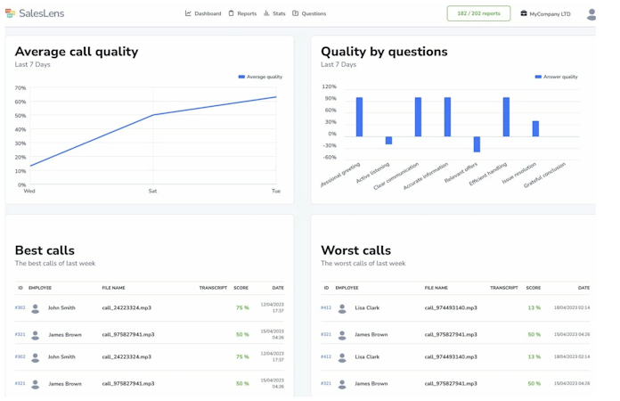 The solution lets executives calculate key performance indicators for sales teams, helping them improve development areas and conversion rates. SalesLens allows businesses to compare and rate the quality of their salespeople's conversations with real-time statistics to identify the best performers.